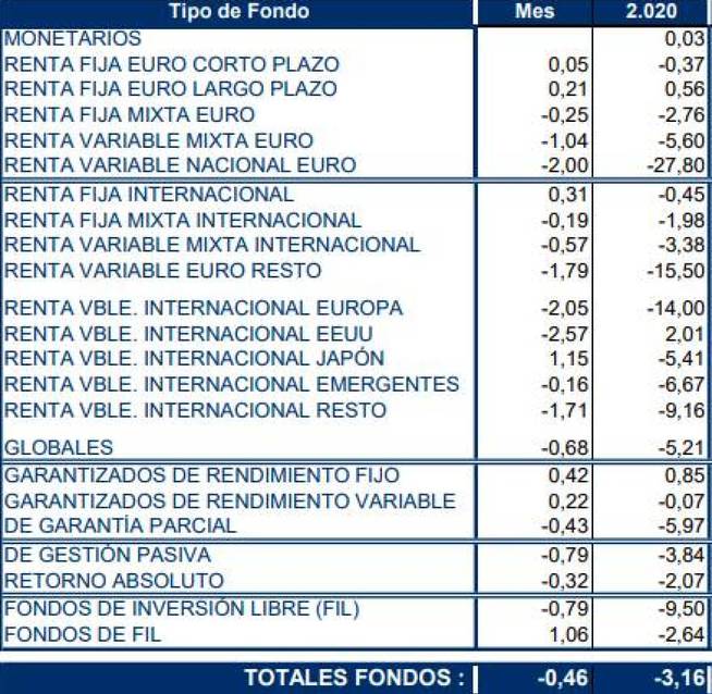 Podríamos hacer un ejercicio similar, con la vuelta al alza que se produjo en los mercados, especialmente en los Bonos y la Renta Variable Norteamericana. Hagámonos esta sencilla pregunta: ¿ Quiénes apostaban por un escenario de recuperación del tipo vuelta en "V", cuando la mayoría de la población mundial estaba confinada, y por tanto la economía parada ?. La respuesta la podemos obtener de la evolución en el año de las principales categorías de Fondos de Inversión comercializados en España, como publica hoy en su web el diario el confidencial: