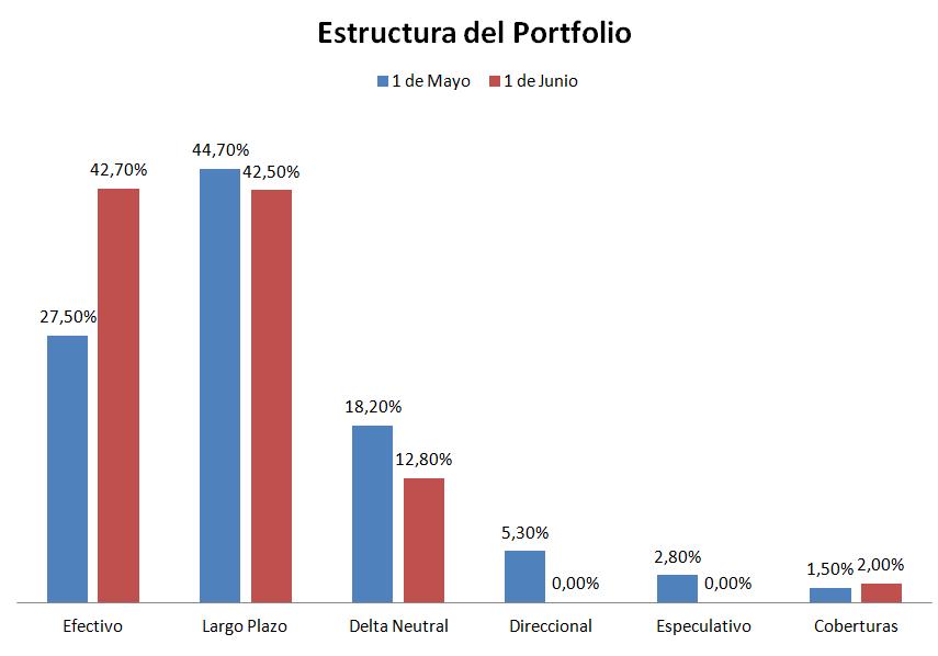 Delta Neutral. He bajado de un 18.20% a un 12.80% lo que significa una reducción significativa. Es una parte del portfolio enfocada a trabajar el corto/medio plazo desde un enfoque neutral en precio. Reducir bruscamente este apartado del portfolio no es posible hasta la semana de vencimiento de opciones.
