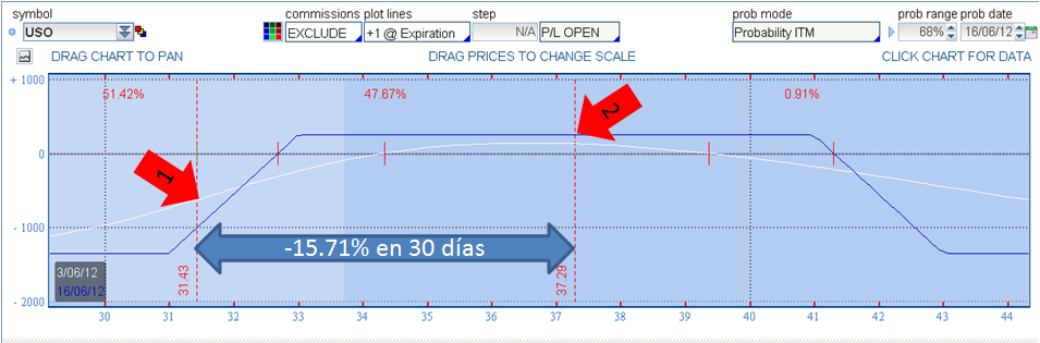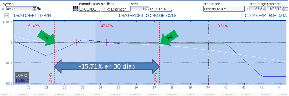 Se puede optar por seguir trabajando y ajustando si procede la posición. Si el precio sigue bajando sobre 29.24 entramos en beneficios y si se da la vuelta en 32.66 también entramos en beneficios. Eso si cada vez quedará menos tiempo para el vencimiento y la posición será cada vez más arriesgada