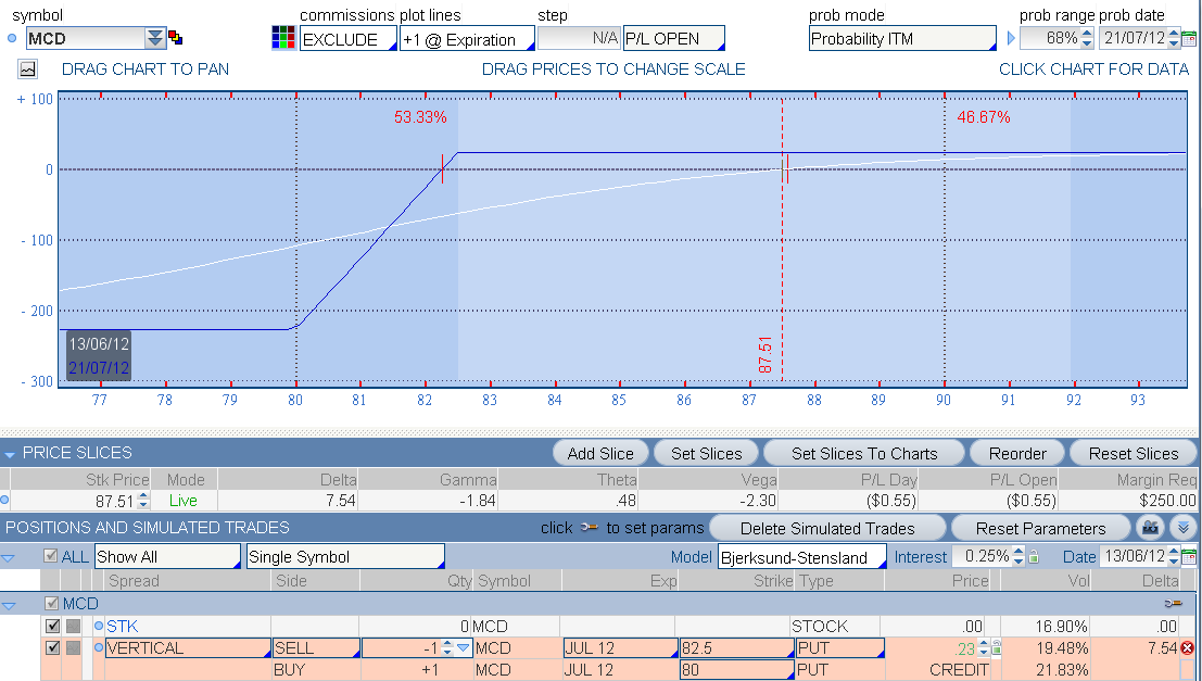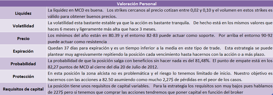 1. Que voy a vender una Put (Short Put) en 82.50 para el vencimiento de Julio. Si MCD está por debajo de 82.50 el tercer viernes de Julio estaré obligado a comprar acciones a 82.50.