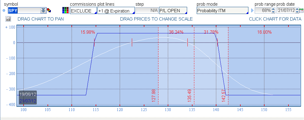 La idea de trading nº 2 consistía en una Iron Condor del SPY para el vencimiento de Julio. Si decidiste trabajar esta posición ahora está con pérdidas del 7.06% en 14 días y ya alcanzó la zona donde definimos las resistencias. Es momento de vigilar muy de cerca esta posición pues si rompe los 136 puntos hay que ajustarla ya que de no hacerlo asumirías mucho riesgo.
