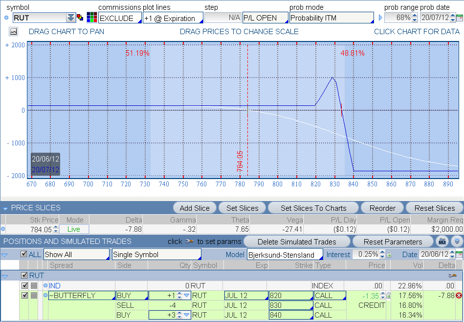 En este caso estoy proponiendo la operación en el RUT que ayer cerró en 784.05 y con la misma filosofía que el spread con Puts (+1 -4 +3). A mí la operación no me gusta mucho, sobre todo si la comparas con la posición inversa que metí en el SPX. Si observas las dos verás grandes diferencias. Adjunto el gráfico de riesgo de aquella operación.