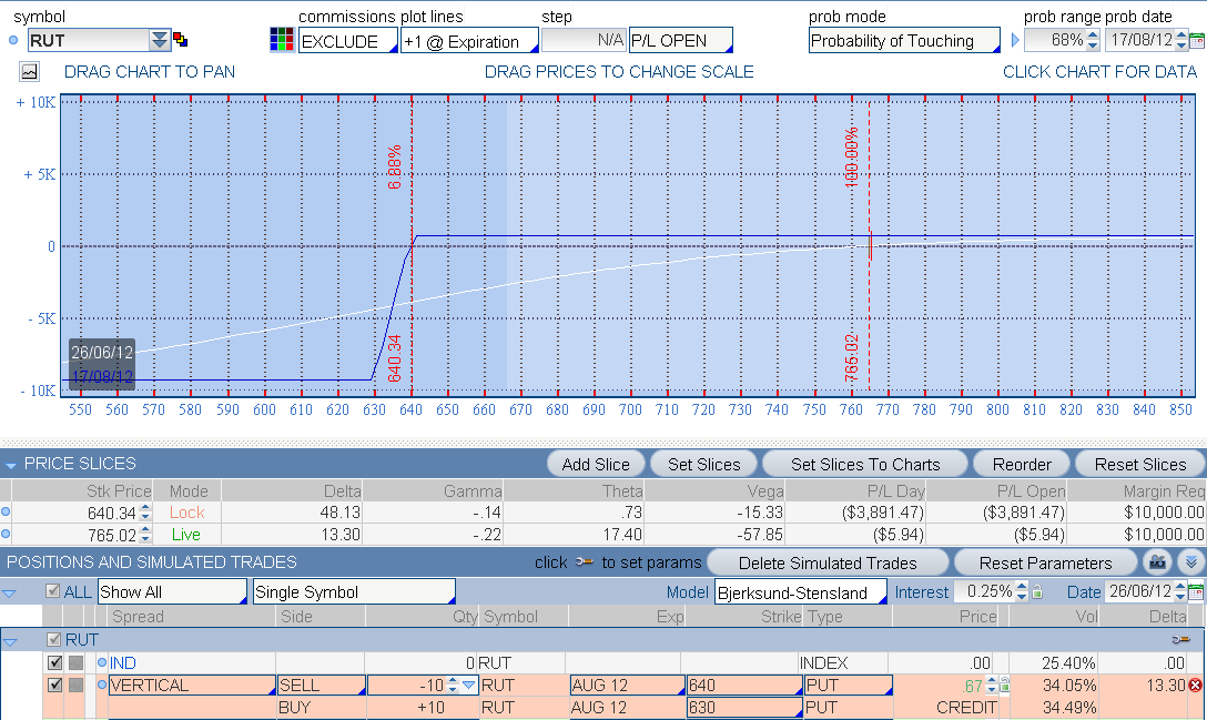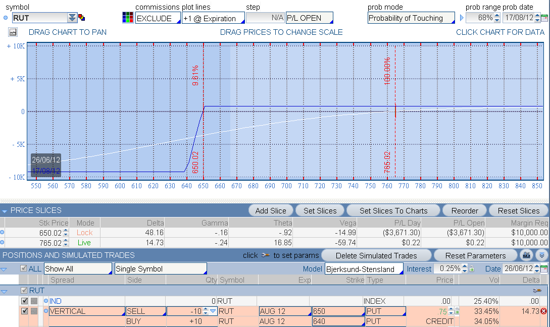 1. Me quiero posicionar ligeramente alcista con una Bull Put en el RUT (Rusell 2000) para el vencimiento de Agosto.