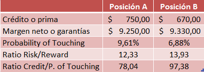 Si aún no lo ves claro, voy a igualar el crédito obtenido en las dos posiciones y a dejar los valores del probability of touching idénticos (ver gráfico de la izquierda). Ahora los datos son más obvios: a igual prima y riesgo prefiero trabajar la posición que tenga menor probabilidad de necesitar ser ajustada. La posición B es esa posición pues tiene un valor más alto en el ratio Credit/Prob. of Managing.