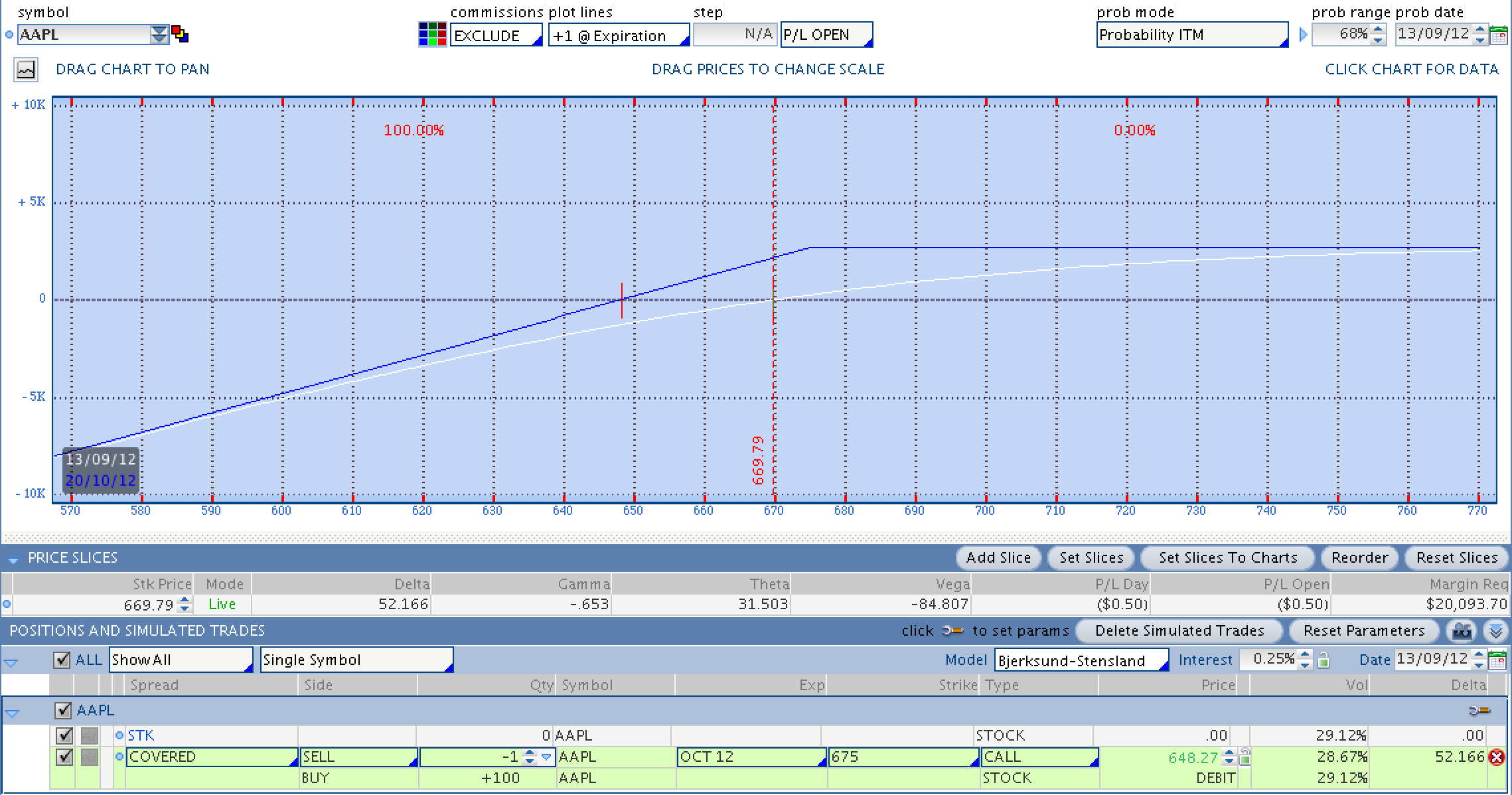 A modo de ejemplo adjunto una covered call de Apple (AAPL) donde puedes ver como he comprado las acciones de AAPL y he vendido una call en 675. Apple está cotizando en 669.79 y la operación me sale por 648.27.