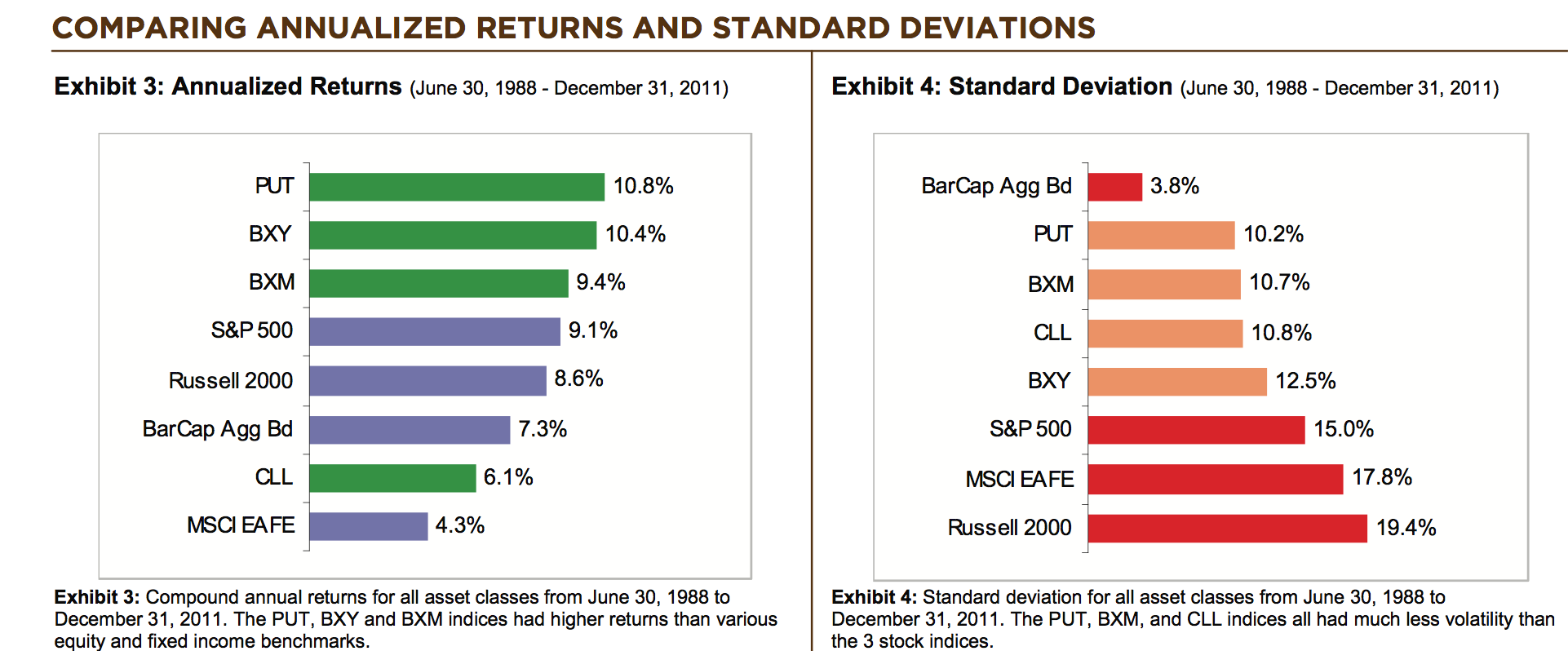 El BXM usa la Covered Call vendiendo la short call ATM y el BXY usa la Covered Call vendiendo la short call un 2% ATM