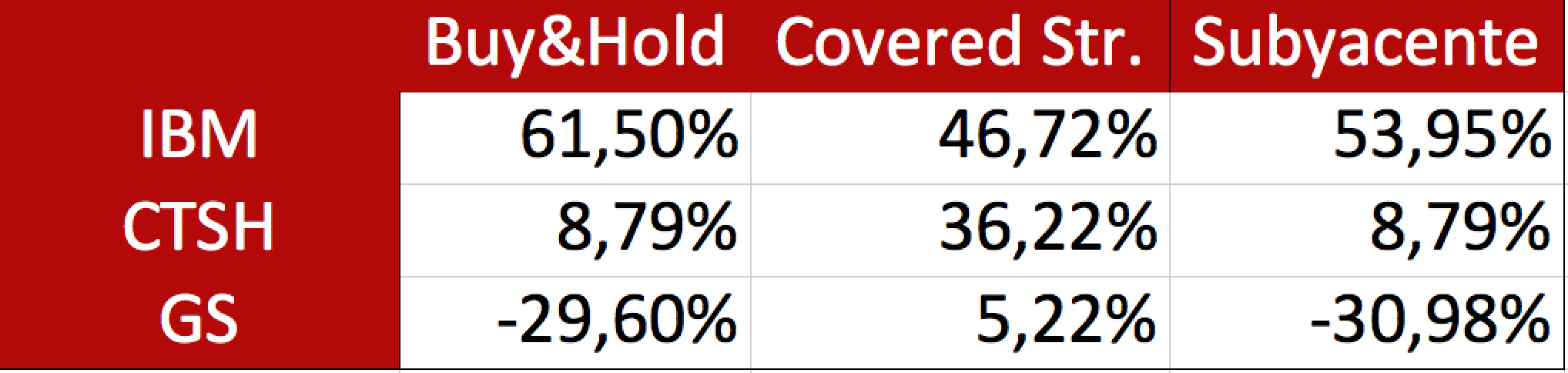 Los datos son para 3 acciones (IBM, CTSH y GS) aplicando la misma estrategia entre el 18-08-2010 y el 10-08/12. Se compara lo que ha hecho el subyacente, el rendimiento del Buy & Hold incluyendo dividendos si procede y el rendimiento de la estrategia.
