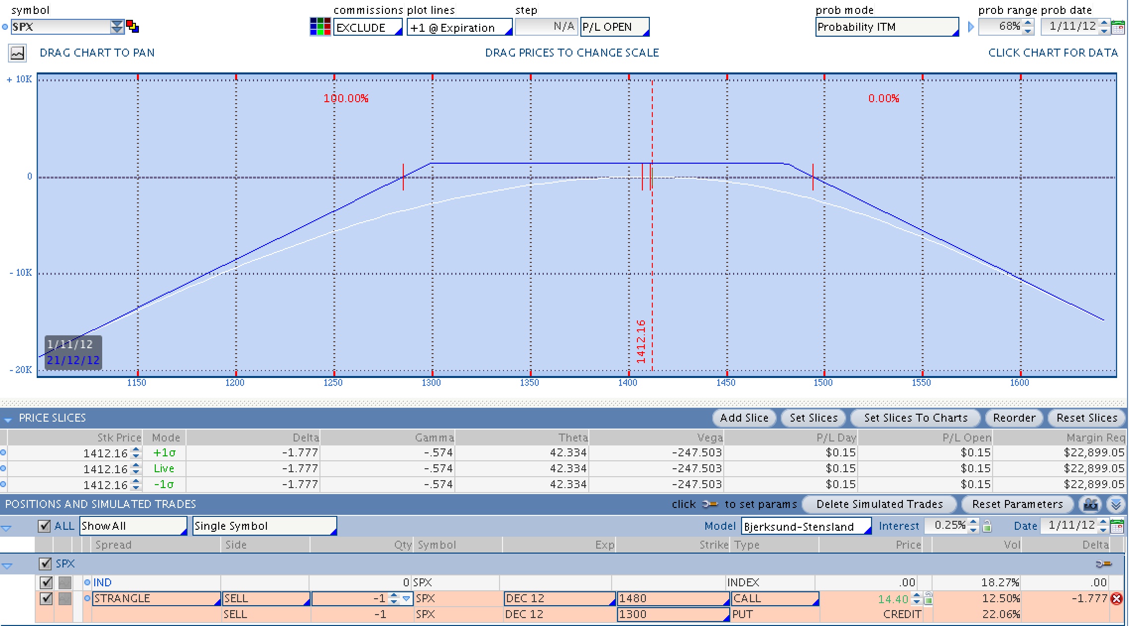 Una cuna vendida es equivalente a un short strangle y una cuna comprada es el equivalente a un long strangle. En la siguiente imagen puedes ver una cuna vendida: