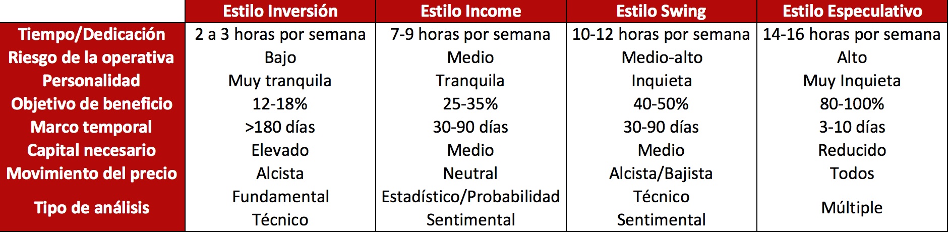 En primer lugar he querido hacer una tabla resumen con distintos elementos que componen un perfil relacionados con cada estilo de trading. A continuación tienes dicha tabla: