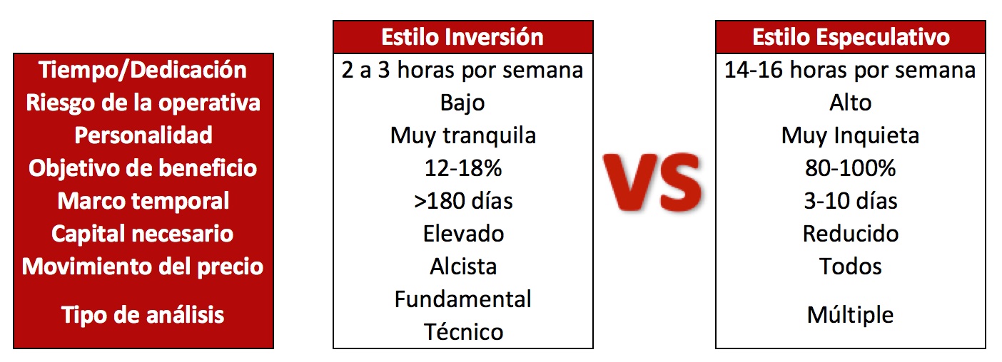 La comparativa valoraba ciertos aspectos del trading como el riesgo, el tiempo de dedicación, beneficio objetivo, etc. A continuación tienes una imagen resumen de la comparativa: