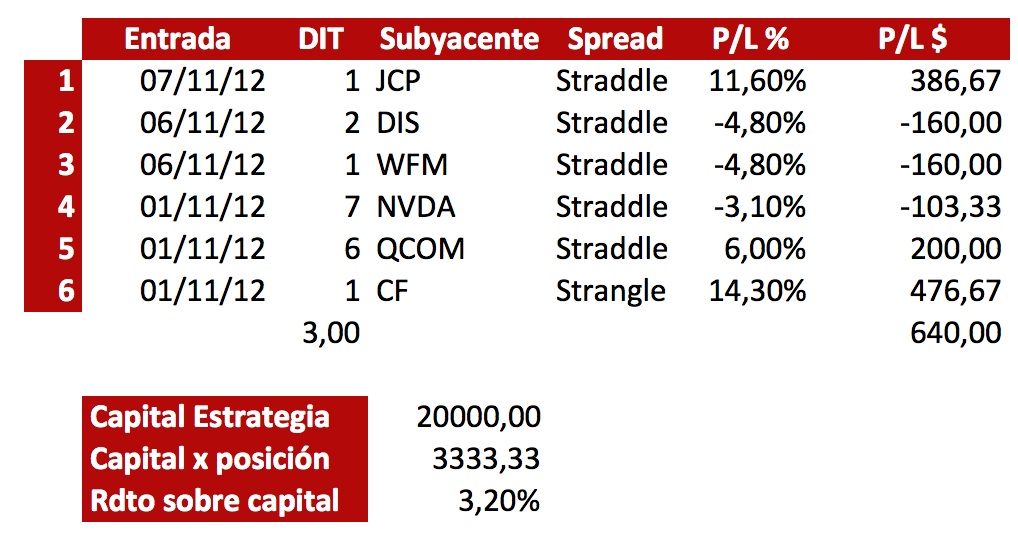 Me mojo un poquito más… Adjunto los resultados de una estrategia especulativa muy sencilla que opero. La estrategia consiste en dividir el capital asignado a la estrategia en 6 o 7 partes, estudiar las compañías que anuncian earnings la siguiente semana y posicionarse con straddles o strangles en las que más movimiento han tenido en los últimos anuncios de earnings.