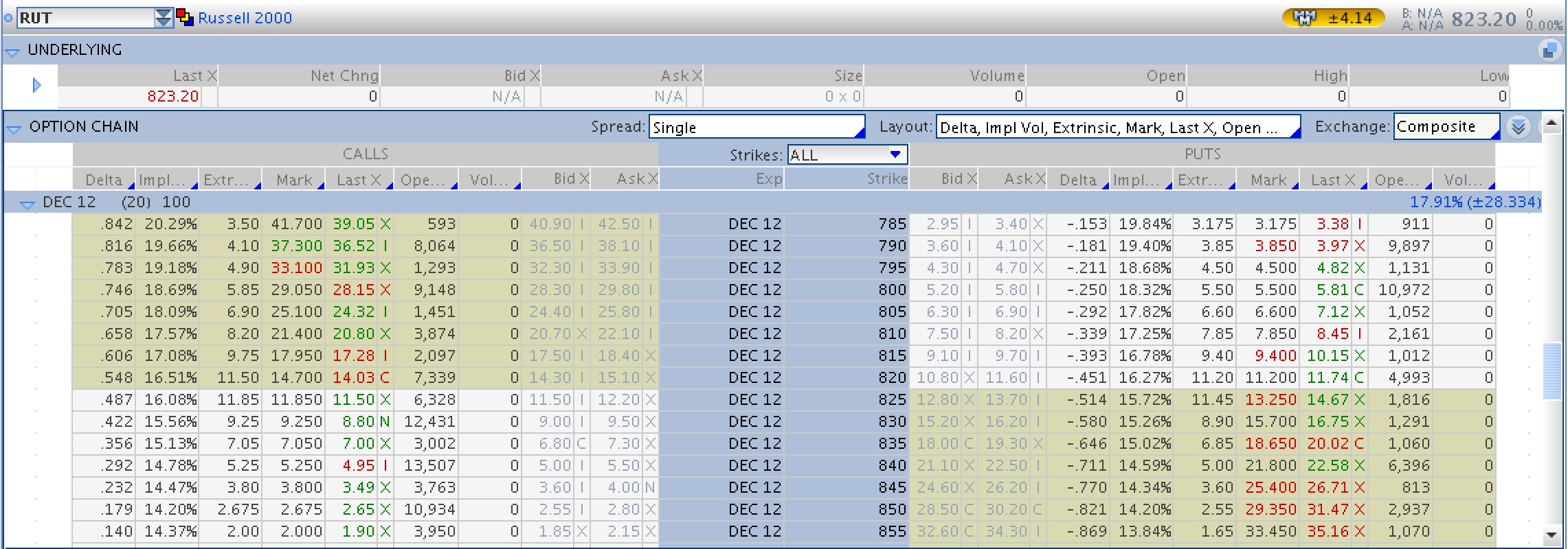 En la imagen siguiente que se corresponde con la liquidez del RUT en el vencimiento más cercano puedes ver como intentar cerrar 2000 contratos del RUT sin ser visto y atacado es una quimera (ver columna Open Interest)