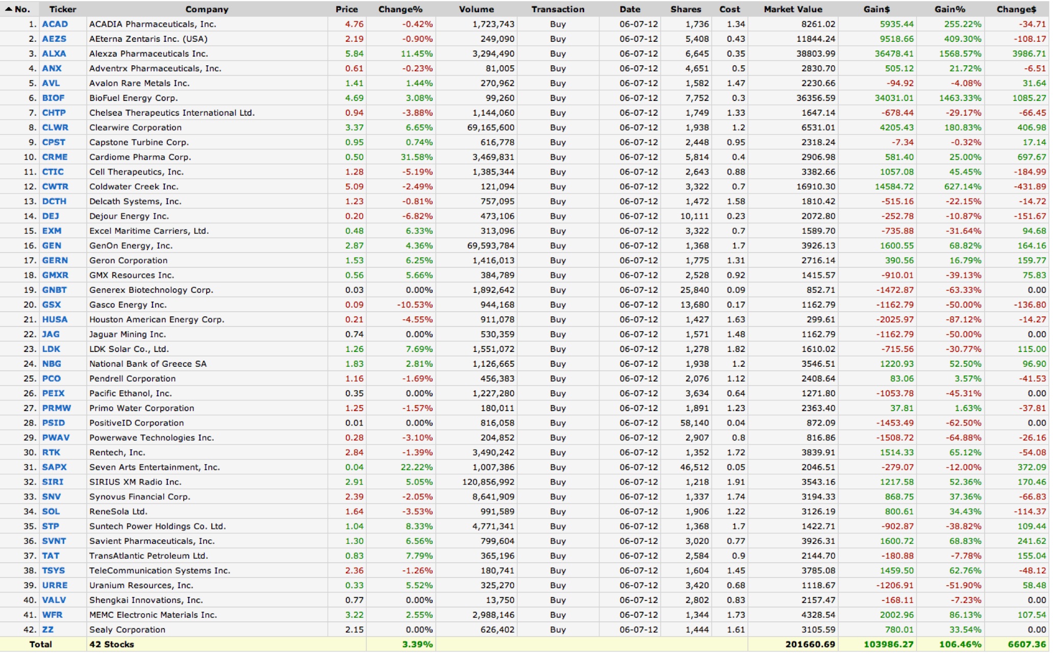 Me gusta operar opciones, me relaja y me hace sentirme cómodo y bien, te hacen pensar mucho y estar siempre estudiando y aprendiendo. Pero los chicharros, son los chicharros, me capitalizan abultadamente continuamente. Os pongo un ejemplo de una operativa en demo, puesto que no dispongo de tanto capital para mis inversiones. Seleccioné un portfolio de acciones-chicharros americanas en julio y este es el resultado a fecha de hoy: