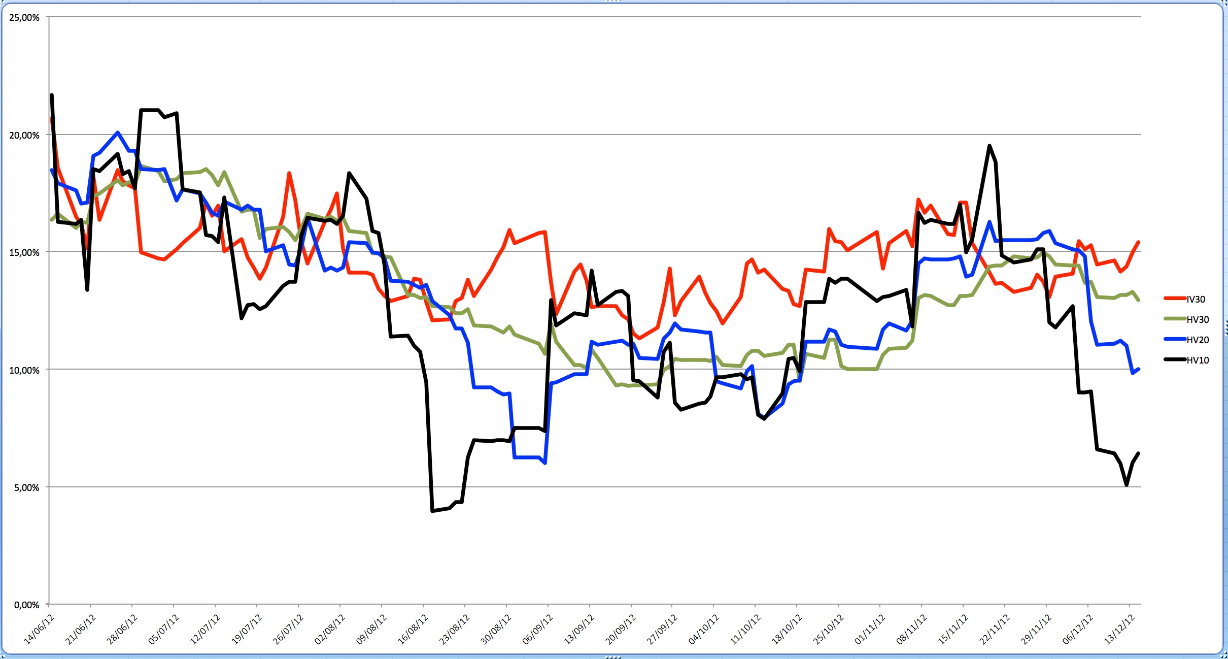 Cambiando de tercio…. Otra casualidad más con Mark!!! Mark publicaba el pasado día 11 un post donde comentaba el escenario tan especial de volatilidad en el que estamos (el mercado se está cubriendo más de lo que parece). Indicaba lo especial de la situación mostrando un gráfico con la volatilidad histórica a 10, 20 y 30 días más la volatilidad implícita a 30 días. A continuación tienes el gráfico que publicaba Mark extraído de LiveVol (una gran herramienta).