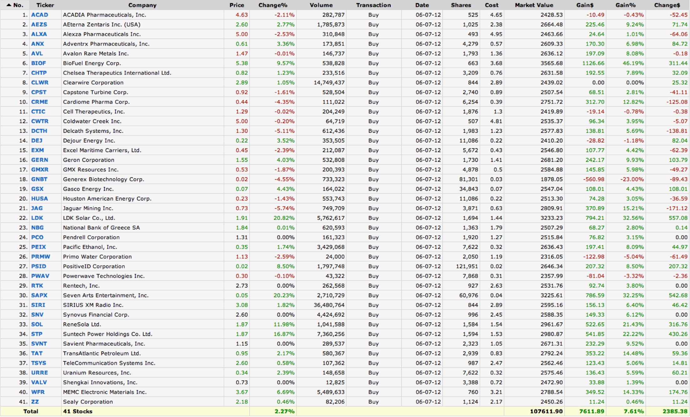 Y para terminar adjunto una nueva selección de penny stocks. En este caso he aplicado mis criterios de nuevo y compro 100.000$ en 41 acciones con un reparto proporcional del capital.