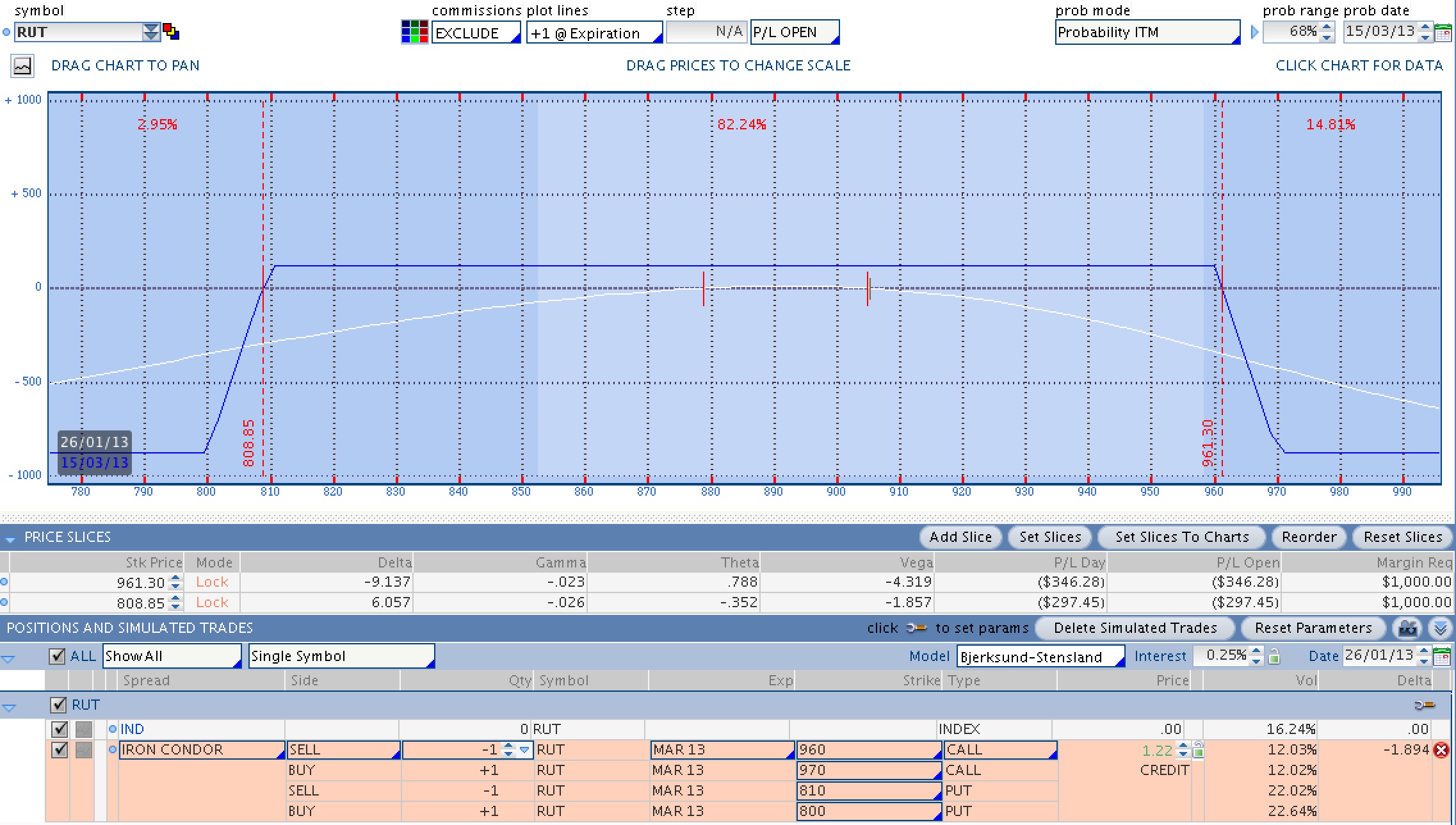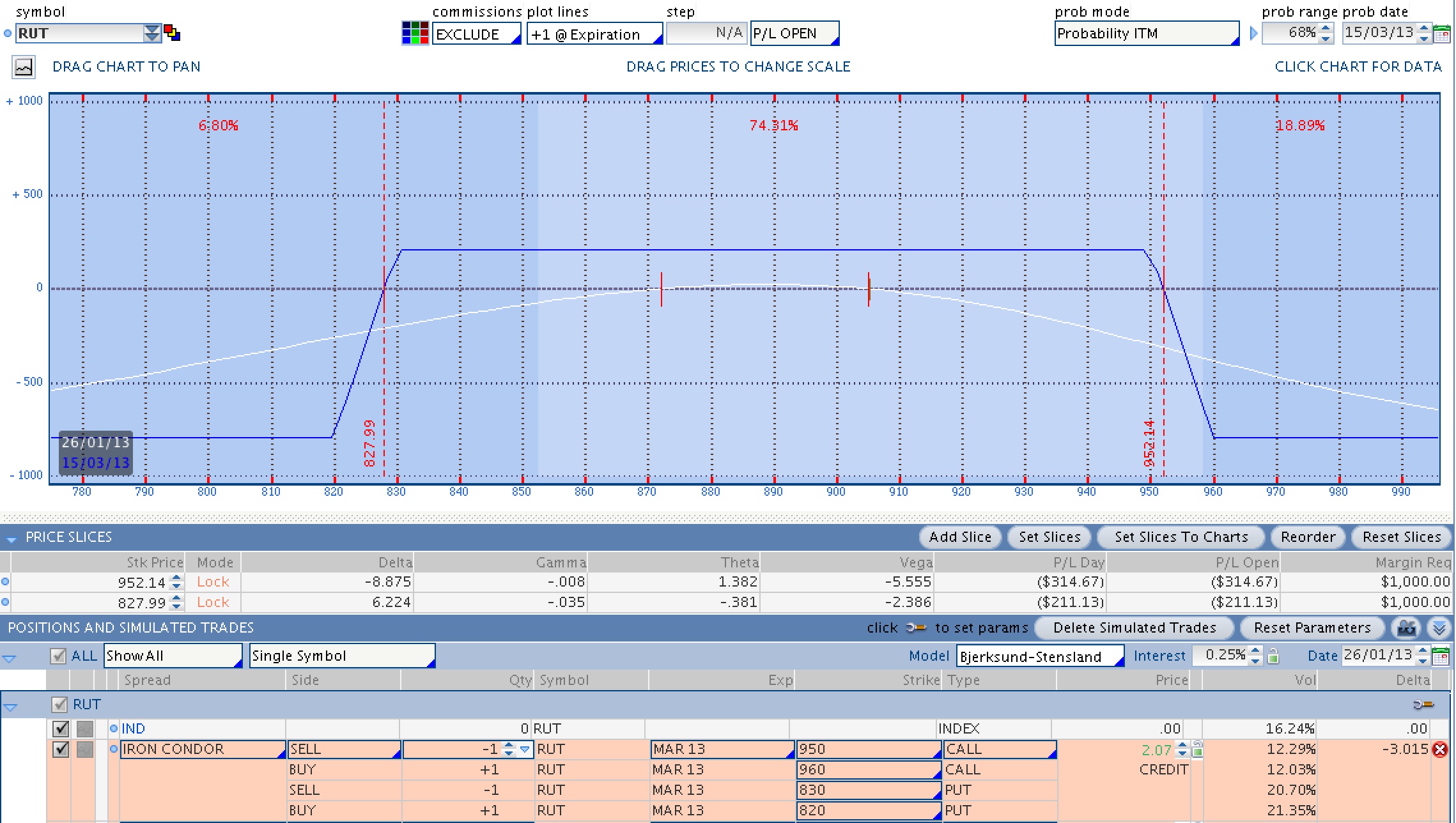 El dato más característico de una Iron Condor de alta probabilidad es que su probabilidad de beneficio a la expiración se sitúa entre el 80 y el 85%. A continuación tienes una sobre el RUT capturada hoy mismo.