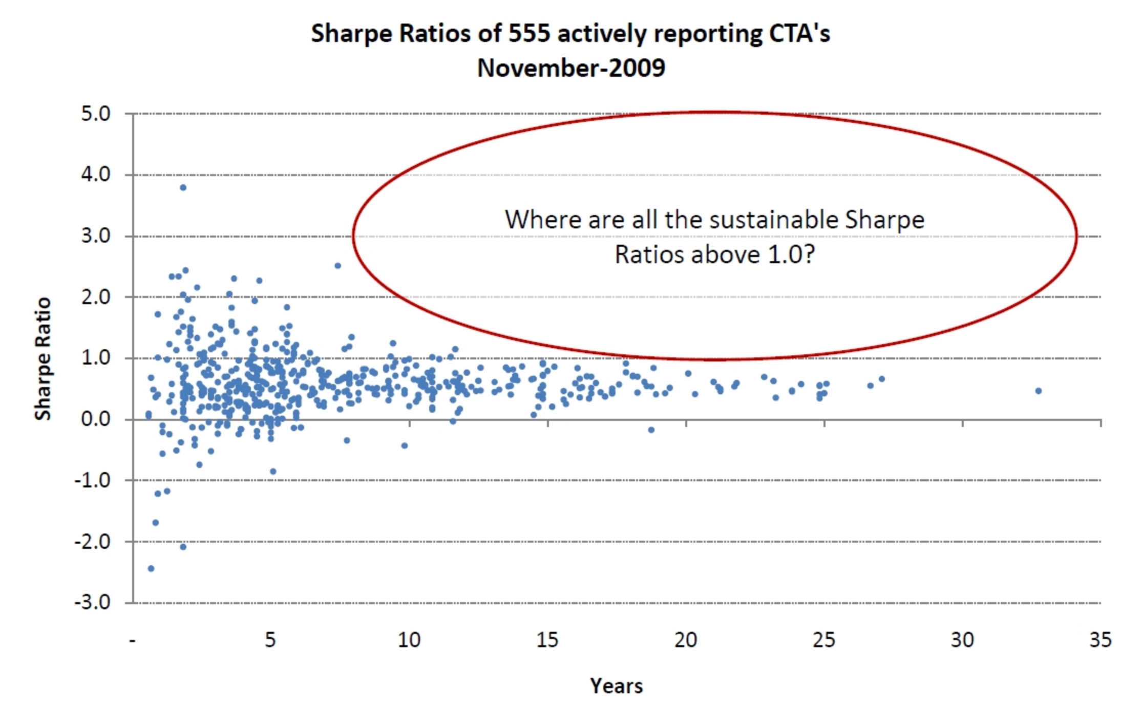 Siguiendo con mi investigación y teniendo en mente cómo es posible que solo tres CTA de 555 tengan un ratio de Sharpe mayor a uno localice este gráfico de un estudio sobre ese mismo tema: