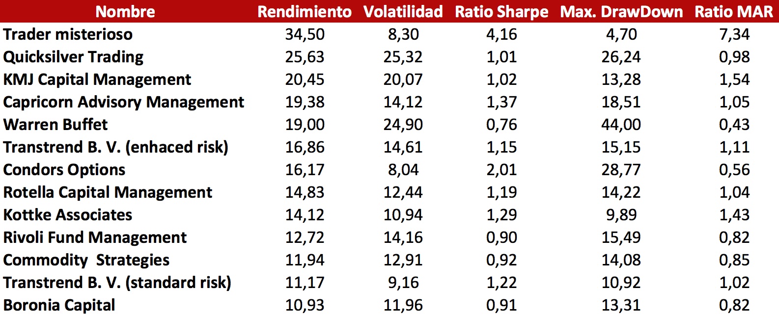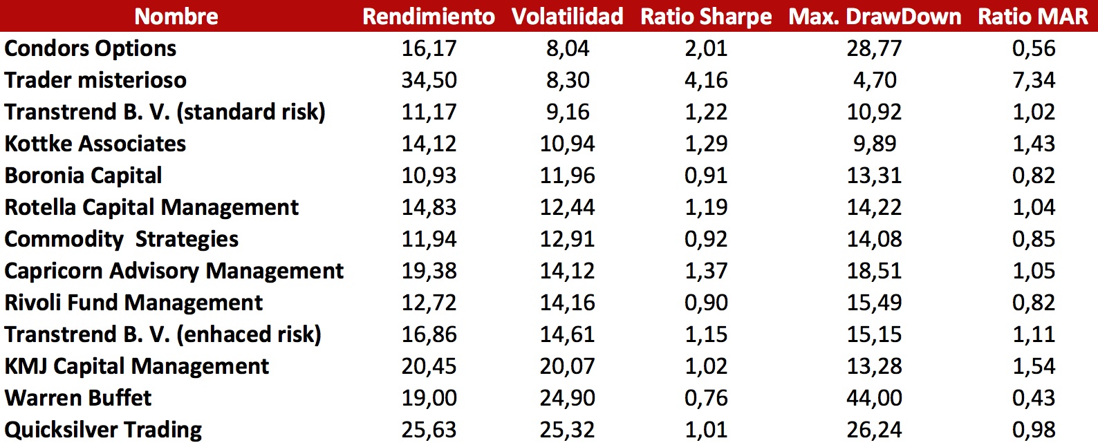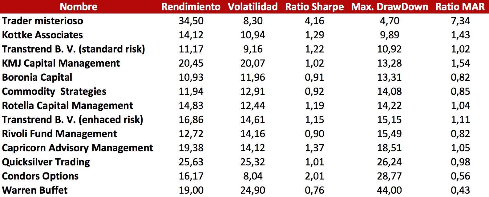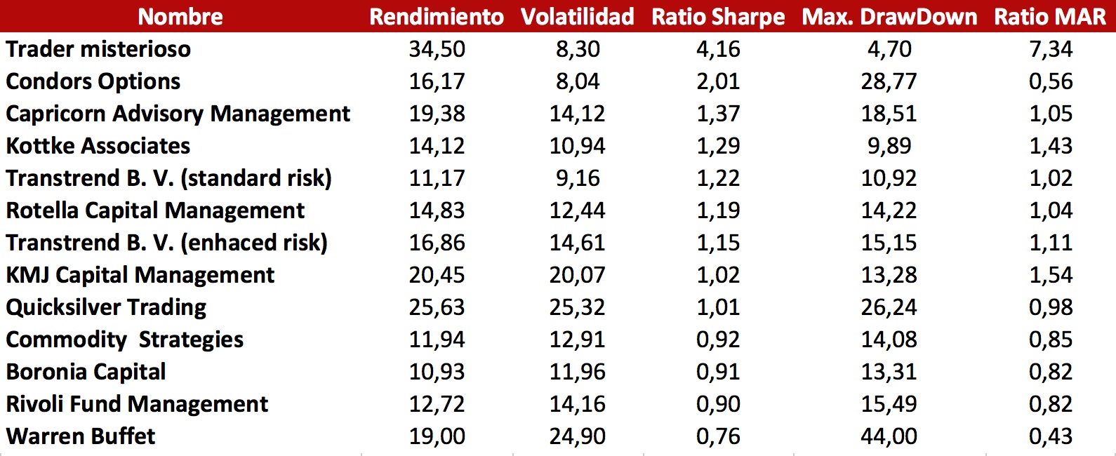 Ahora ya podemos comparar a todos… voy a añadir los 10 mejores CTA, con nuestro trader misterioso, más Warren Buffet y además los datos de un servicio de señales (condoroptions) y los voy a ordenar por múltiples conceptos: