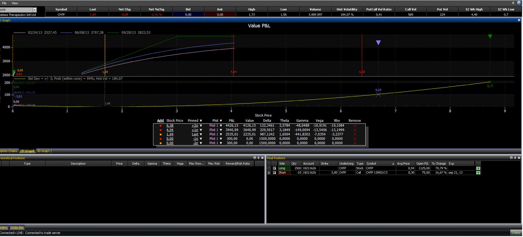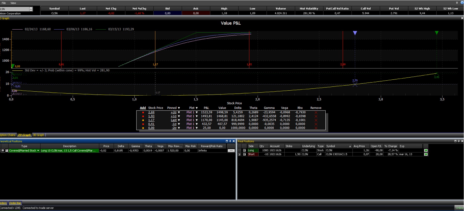 La segunda operación que tengo es sobre CLSN. Al revés que en la anterior en este caso opte por abrirlas con formato Covered Call (1000 acciones compradas y 10 Short Call vendidas).