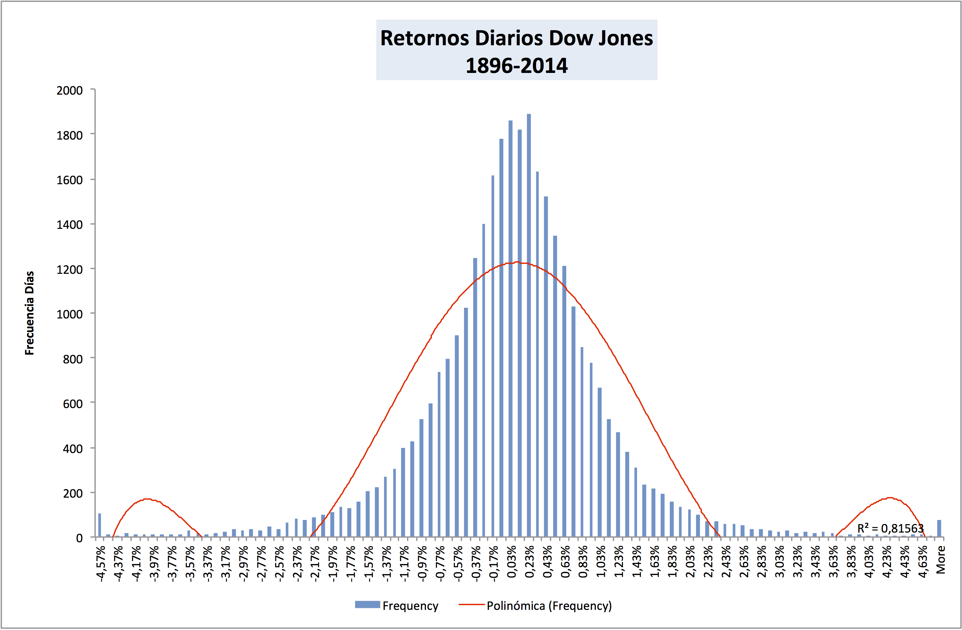 En total he analizado 32.081 días de precios de cierre del Dow, es decir, 123 años de historia, desde 1896 hasta 2014. Para ver los retornos diarios he aplicado la fórmula: