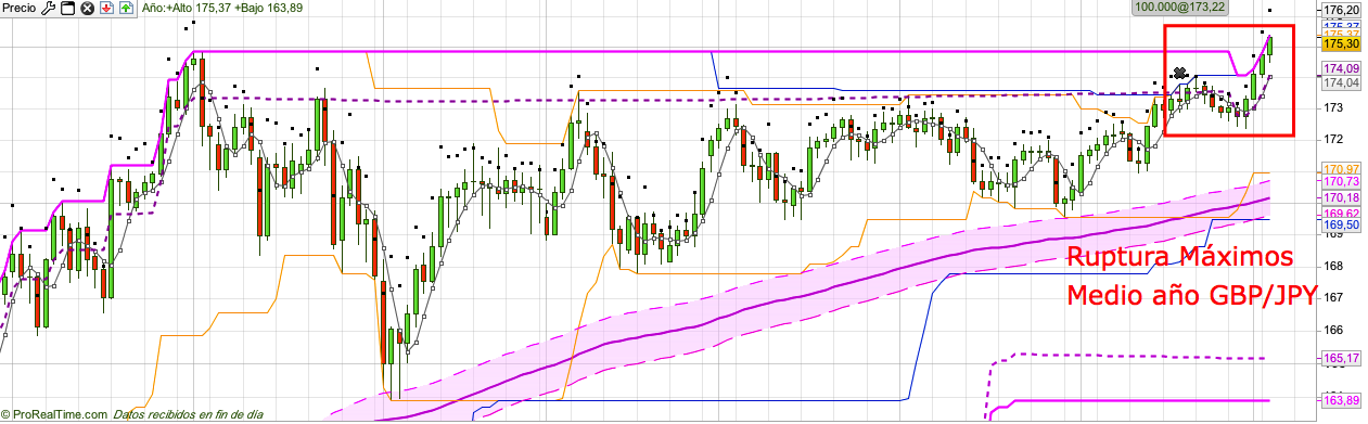 En Junio han ocurrido algunos movimientos interesantes en mercados como el petróleo y la libra, esta última en el par GBP/JPY ha experimentado un "breakout" que ha hecho saltar los máximos de medio año. En mi operativa este hecho es muy relevante para prestar especial atención a los mercados que cumplan esta premisa.