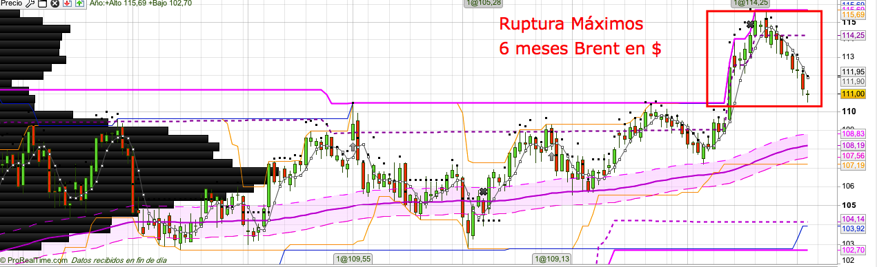 Como se puede observar en le gráfico la cotización del brent está volviendo a la zona de ruptura.