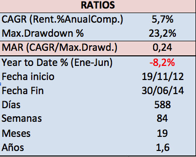 Seguimos en 2014 en números rojos (YTD -8,2%), veremos si le doy la vuelta a la tortilla en los próximos meses. En una situación como esta siempre me acuerdo que la "bolsa no paga salarios", para cuentas pequeñas como la mía es mejor tener ingresos fijos derivados de otras actividades para pagar las facturas.