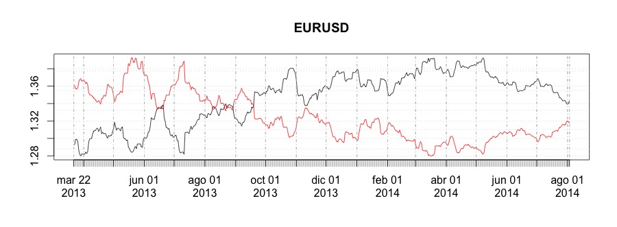 Podemos coger del mercado Forex dos de los pares con la mayor correlación posible como EURUSD y USDCHF para dar un con un vector de cointegración. Es un proceso sencillo con paquetes estadísticos gratuitos como R.