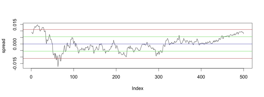 A través de tests estadísticos como el de Dickey-Fuller o de Hurst podemos comprobar si las series son estacionarias. En este ejemplo vemos como se ha comportado nuestro spread a lo largo de las últimas 500 sesiones.