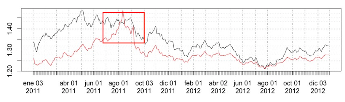 Algo pasó a mediados del 2011 que hizo que la correlación "normal" de los pares EURUSD y USDCHF se desvaneciera durante un período de tiempo. Me acuerdo muy bien de aquellos meses, el ambiente estaba muy revuelto con el Franco Suizo debido a la crisis de deuda soberana. Como siempre la intervención humana, en este caso de los Bancos Centrales, pueden destrozar este tipo de estrategias de arbitraje estadístico.