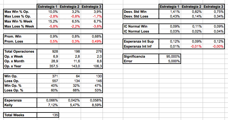 - Intervalo de confianza y Esperanza Mejor/Peor escenario = Con las desviaciones estándar de las operaciones ganadoras y perdedoras establezco un intervalo de confianza asimilando que los retornos se distribuyen según la normal. En el mejor de los casos la esperanza matemática obtenida en la estrategia 1 con un 95% de probabilidad, podría alcanzar un valor de 0,12% pero por la otra parte me daría un ridiculo 0,01% o lo que es lo mismo prácticamente no habría ganado nada. En el caso de la estrategia 2 y 3 me llevaría a entrar levemente en terreno de pérdidas en el peor escenario.