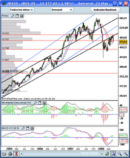 o) y estamos chocando con la parte inferior de este sin conseguir superarla, y eso en mi casa, no es buena señal. Cierto que no hace mucho tiempo, a finales del 2006, el Ibex se aceleró un poco y superó ese canal por la parte de arriba, marcando una señal alcista bastante fuerte, que al final como se puede comprobar en el gráfico, quedó cancelada, pero ahora estamos en la parte contraria, en la parte inferior, y mientras sigamos aquí... mal asunto.