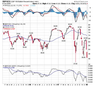 Como puede apreciarse en el gráfico del SP100 Bullish Percent Index, anoche cerró en los 41 puntos, muy cerca de los minimos del pasado mes de agosto, que fue en 37. Si, aun queda algo de margen, cierto, pero la proximidad es altisima, lo cual indica unos muy elevados niveles de miedo y eso es algo que debemos aprovechar si deseamos hacer compras en el mercado.