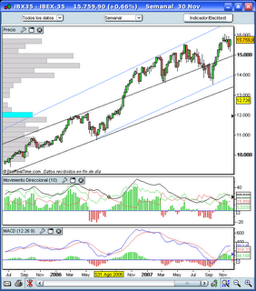 Los indicadores tendenciales del Ibex35 aun no han dado señal de venta, algún signo de cansancio si que es posible observar en el Movimiento Direccional, pero señal de venta, aun no tenemos. Ademas, los canales alcistas continuan intactos por lo que no deberiamos vender ni lo mas mínimo.