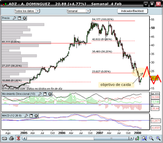 El caso de Adolfo Dominguez es interesante, ya que no solo ha alcanzado el precio objetivo bajista desde que comenzó a corregir a finales de 2006. No solamente lo ha alcanzado sino que está realizando una ligera extensión del mismo.