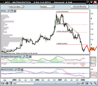 Tremenda la caida de Natraceutical desde los 2,2 Eurs hasta la zona de 0,85 actual. Como bien sabemos, se trata de un valor muy especulativo en el cual, solo entramos para aprovechar algún movimiento a nuestro favor, ó porque tenemos la compañia cerca de casa y confiamos en ella para convertirnos en accionistas suyos. Personalmente no puedo aplicar la segunda opción.