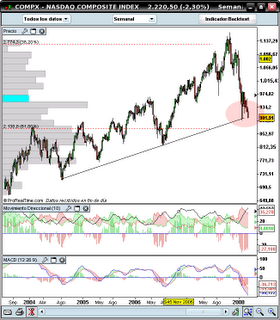 Miedo da ver la zona en la que se paró anoche el precio del Nasdaq Composite, y mas miedo da pensar que si la pierde, se van a activar numerosas señales de entrada bajistas en el mercado, ademas de la espiral que se forma con la rotura de los stop-loss y el vender como sea antes de que caiga mas.