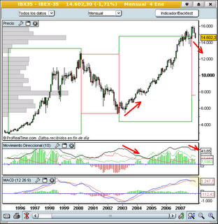 Otro tema que continua llamando mi atención, es el gráfico del Ibex35 en mensual. Hace algunas semanas ya lo subia por aquí, como una simple observación, pero por extraño que parezca, da la sensación que el guión está cumpliendose, y al igual que ocurrio en el año 2000 podriamos estar viendo los máximos de los máximos, y los próximos 2 años ser totalmente bajistas para el selectivo nacional.