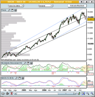 Revisando el gráfico semanal del Ibex35, se aprecia como el precio ha perdido la parte superior del canal alcista inicial, en negro, lo cual nos pone nerviosos a muchos, pero aun confiamos que no pierda la parte inferior del azul, el canal alcista mas acelerado en el que se encuentra, y que se mantenga en él durante algún tiempo mas... cuanto mas, mejor, por supuesto.