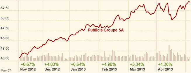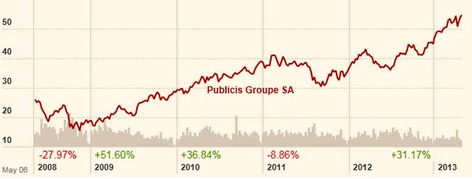 Publicis Groupe está presente en la bolsa de París con una capitalización de 11.500 millones de euros. Además cotiza en otros mercados internacionales en Nueva York, Londres o Frankfurt.