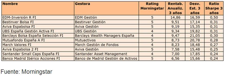 Asimismo es habitual verlo incluido en los análisis de fondos de inversión. A continuación se muestra también una tabla comparativa realizada por FundsPeople, en el artículo "Los 10 fondos de renta variable española con mejor ratio sharpe a tres años". En el mismo se comparan los diez fondos más destacados, todos ellos con cuatro o cinco estrellas otorgadas por Morningstar. Entre ellos pueden encontrarse fondos como el Bestinver, creo que uno de los más mencionados en este portal, o el Aviva Espabolsa, gestionado por José María Díaz Vallejo, para los más veteranos de Rankia conocido como TheRebuzner, como mencioné en un post anterior.