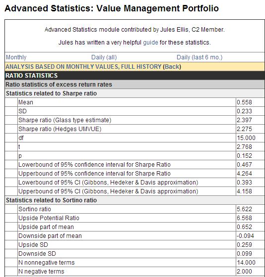Otras empresas de inversión, en este caso relacionada con la venta de señales y sistemas de inversión como es Collective 2, también utilizan este ratio para medir la capacidad de los mismos. A continuación se puede ver un ejemplo del sistema que mantengo alojado en la misma durante prácticamente un año y medio: Value Management Portfolio, y al que es posible seguir o suscribirse de manera gratuita. Durante la vida del mismo el Sharpe Ratio calculado en base mensual ha sido del 2,397 (ligeramente menor es a tasa diaria, del 2,325; y muy sumilar a la de los últimos 6 meses a tasa diaria, de 2,305). Analizando el sistema mediante el ratio de Sharpe con los rendimientos obtenidos la conclusión es que a pesar de ser en los últimos meses algo menores a lo habitual ésto es debido a una disminución del apalancamiento, operando con mayor cautela dadas las condiciones de mercado. En el caso de que los rendimientos obtenidos fueran menores y el ratio de Sharpe fuera asimismo notablemente inferior (indicando menor rentabilidad al mismo o mayor riesgo) cabría analizar en mayor profundidad a qué se debe el empeoramiento del mismo y buscar opciones a tomar para paliar la situación.