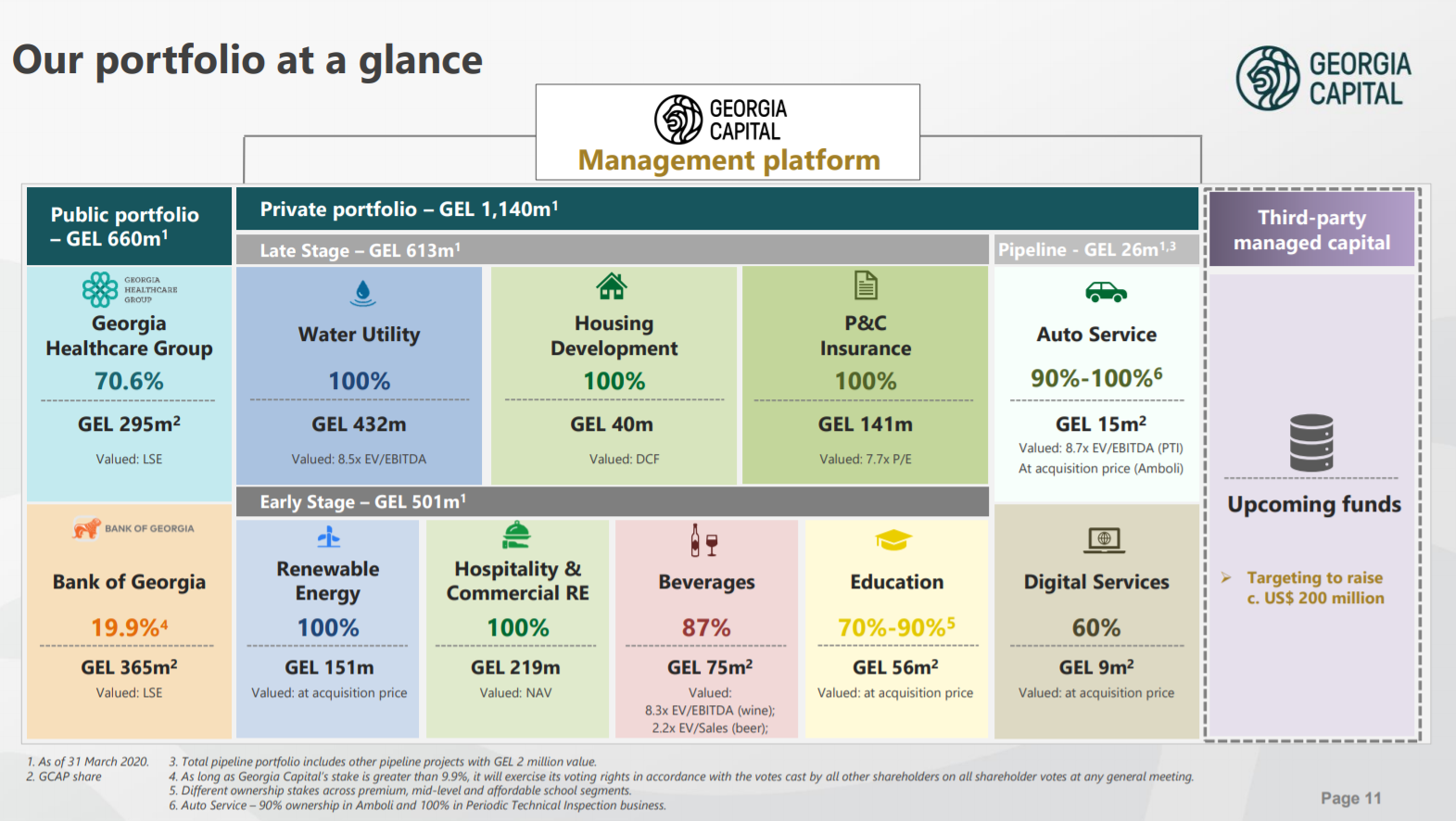 Georgia Capital es un holding que invierte en compañías cotizadas y no cotizadas en Georgia. Aunque pueda parecer sorprendente la economía georgiana resulta muy interesante y tiene unas buenas perspectivas a largo plazo. Georgia Capital es una forma sencilla de hacer una apuesta por el prometedor futuro de este país, ya que a través de este holding tenemos en propiedad negocios de calidad comprados con descuento en relación a sus comparables del Cáucaso (y aún mayor descuento con sus comparables europeos).