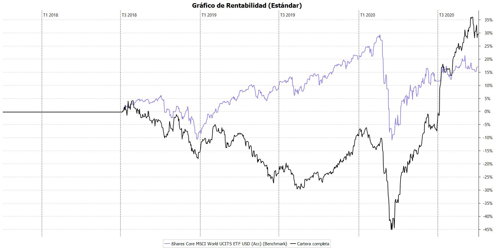 Desde su inicio, el 6 de julio de 2018, la Cartera ha obtenido un +29,95% (+12,37% anualizado) mientras que el MSCI World UCITS ETF (Acc) ha obtenido un +17,32% (+7,38% anualizado). En lo que llevamos de 2020, la cartera ha obtenido un +42,48% mientras que el MSCI World UCITS ETF (Acc) ha obtenido un -2,17%.