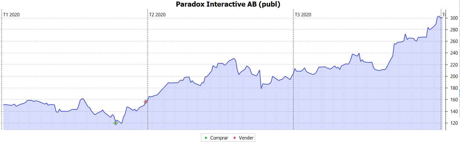 Paradox Interactive es un claro ejemplo de empresa de calidad que vendí demasiado pronto. A pesar de obtener un +31% en 3 semanas (que está muy bien), si hubiese sido más paciente ahora sería un +155% en 7 meses.