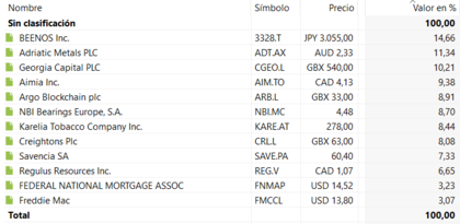 Respecto al tercer trimestre, no ha habido cambios en la principales posiciones, aunque si algunas compraventas en aquellas posiciones de menor peso. Durante los últimos 3 meses, vendí Frill Holdings, United Mobility Tech, Nighthawk Gold y el ETF inverso del S&P 500. Por otro lado, ha entrado en Cartera la empresa británica Creightons plc.