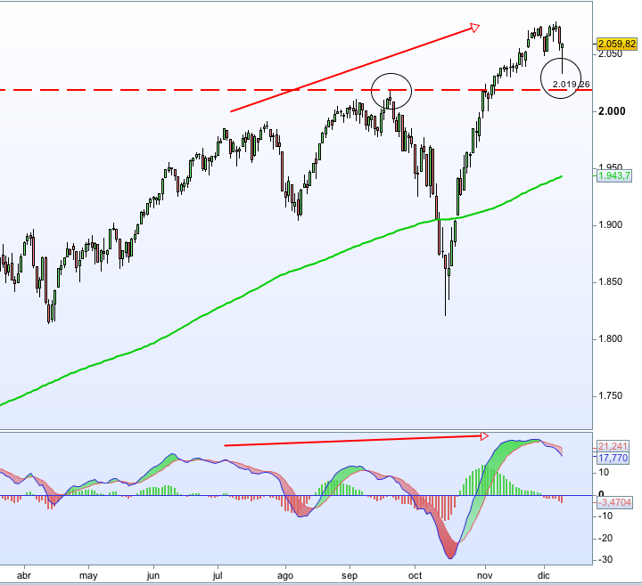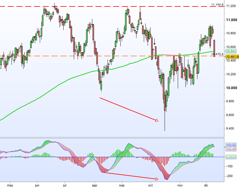 Como vemos, en su descuelgue bajista a mediados - finales de octubre no vimos divergencia MACD, todo lo contrario, el indicador acompañaba la rotura del mínimo y ahora vemos que desde entonces hasta ahora se ha marcado un máximo inferior al máximo de 11200 pts que marcó en septiembre.