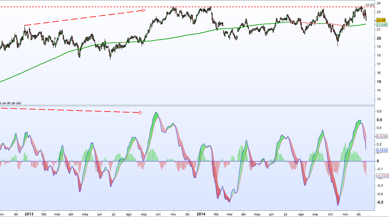 - Divergencia en MACD que comienza en Octubre-noviembre de 2013 donde se marcan nuevos máximos en precio pero no en el indicador, era la primera señal de salida si íbamos largos.