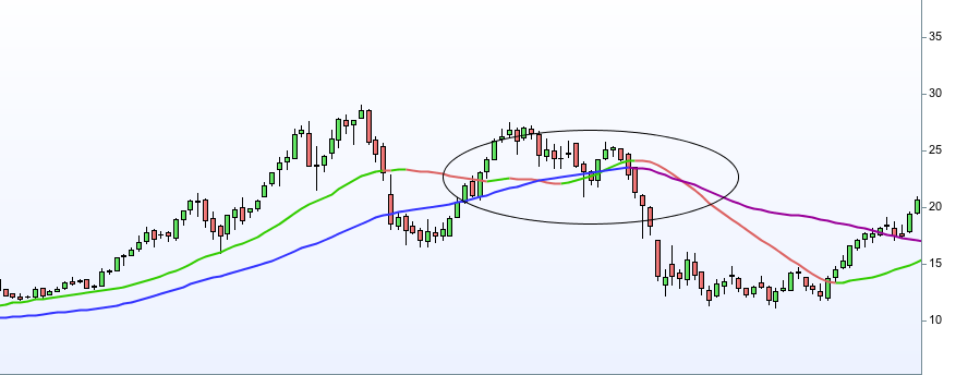 Cuando un valor se mueve de forma tendencial, como el ejemplo que veíamos anteriormente, todo va fenomenal. Vemos que las dos medias se mantienen alejadas formando una pequeña separación y en el momento en el que se crucen cerraremos nuestra posición (tenemos punto de entrada y punto de salida, nos faltaría saber el stoploss antes de comenzar la operación pero son cosas que se podrían solventar).