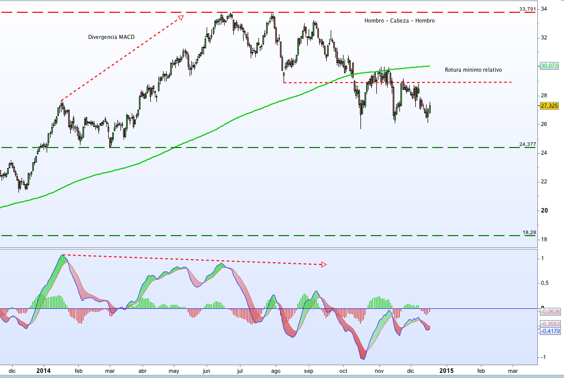 Como veíamos, ACS estaba experimentando una divergencia MACD que anunciaba un movimiento bajista, además se formaba una especie de triple techo o bien hombro cabeza hombro inclinado y se estaba produciendo la rotura del mínimo relativo de 28,5 que nos podía anunciar un arranque del movimiento bajista.